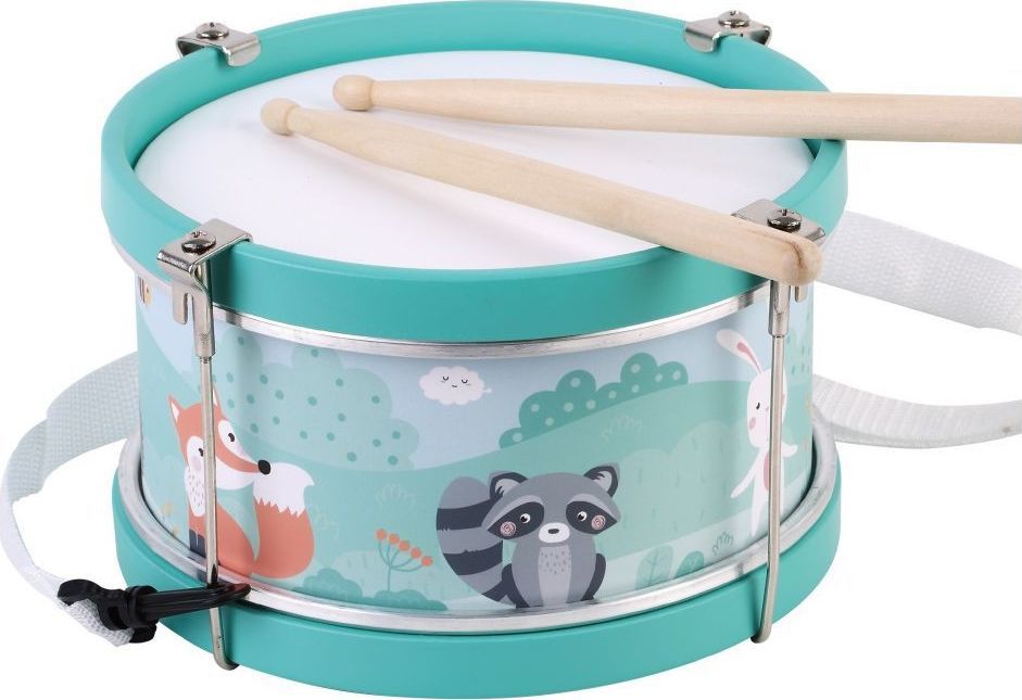 Śliczny bębenek od Adam Toys to świetna zabawka dla wszelkiego rodzaju zabaw ruchowych, rytmicznych i umuzykalniających. Bębenki to jedne z ulubionych zabawek muzycznych. Bębenek zdobią znane Wam już leśne zwierzęta. jest piękny i kolorowy.