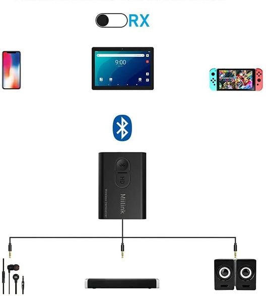 Podłącz odbiornik audio 1Mii Bluetooth do wejścia audio 3,5 mm przewodowego domowego głośnika stereo, a następnie sparuj go ze smartfonem lub tabletem.