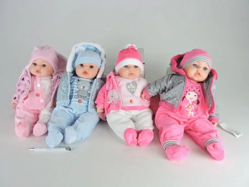Lalka bobas z dźwiękiem. Mówi i śpiewa po polsku. Bobas ubrany jest w polarowy dresik: biała bluzeczka z wyhaftowaną owieczką i różowe spodenki, do tego ma różową kurteczkę w kropeczki, czapeczkę i różowe buciki w białe kropki. Dołączony jest również różowy smoczek. Główka, rączki i nóżki bobaska wykonane zostały z przyjemnego w dotyku tworzywa, zaś tułów posiada miękkie wypełnienie. Lalka w prezentowym pudełku. Zabawka wymaga użycia baterii:3 x LR44-1,5V (dołączone). Przed użyciem należy wyciągnąć zawleczkę. Wymiary opakowania:47,5x13,5x22,5cm Wielkość Lalki:45 cm. Wiek: 3+