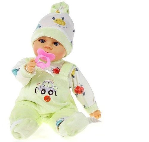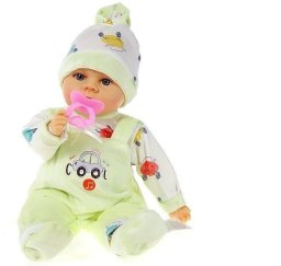 Lalka Bobas w bardzo ładnym ubranku śpioszkach dołączony jest również smoczek. Dzidziuś mówi i śpiewa po polsku. Bobas ma 36 cm. Zabawka zapakowana jest w worek. Działa na baterie: 3xLR44-1,5V(dołączone).