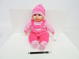 Lalka bobas na baterie. Mówi i śpiewa po polsku. Bobas jest ubrany w różowy kombinezon, czapeczkę, buciki. Dołączony jest również smoczek. Baterie : 3 x LR44-1,5V (dołączone).