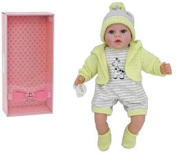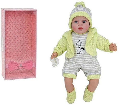 Bobas od firmy ADAR to śliczna lalka, która z pewnością zachwyci najmłodsze dzieci. Lalka wyróżnia się efektami dźwiękowymi. Mówi i śpiewa po polsku. Ma duże, urocze oczy z długimi rzęsami. Bobas ubrany jest w polarowe śpioszki z wyhaftowaną żyrafą, do tego ma zieloną kurteczkę i buciki oraz czapeczkę w tym samym wzorze, jak kurteczka. W zestawie znajduje się również biały smoczek. Główka, rączki i nóżki bobaska wykonane zostały z przyjemnego w dotyku tworzywa, zaś tułów posiada miękkie wypełnienie. Lalka w prezentowym pudełku. Zabawka wymaga użycia baterii: 3xLR44 1,5V(dołączone). Przed użyciem należy wyciągnąć zawleczkę. Wymiary opakowania:47,5x13,5x22,5cm. Wielkość Lalki:45 cm. Wiek: 3+.