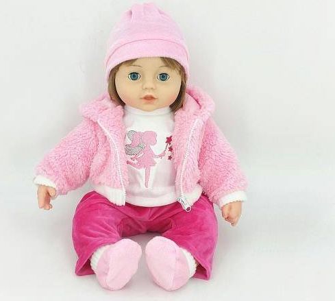 Lalka o długości 45cm, siedząca, zamykane oczy, z dźwiękiem: śpiewa i mówi po polsku.