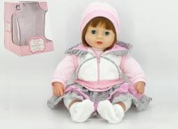 Lalka o długości 45cm, siedząca, zamykane oczy, z dźwiękiem: śpiewa i mówi po polsku. Ubrana jest w białe skarpetki, różową czapkę, różowo-szarą sukienkę, białą kamizelkę. Lalka posiada piękne, długie włosy. Wymiary opakowania: 26 x 34 x 23 cm.