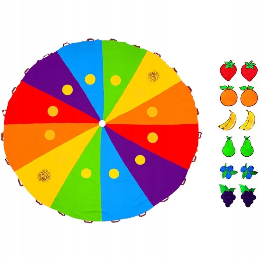 Produkt został wykonany z trwałego, wodoodpornego materiału, co sprawia, że jest łatwy do czyszczenia i nadaje się do użytku zarówno na świeżym powietrzu, jak i w pomieszczeniach. Chusta ma średnicę 3 metrów, jest obszyta taśmą wzmacniającą i wyposażona w 24 uchwyty, co zapewnia bezpieczeństwo oraz długotrwałe użytkowanie.