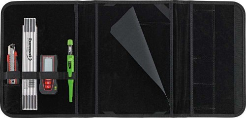 Aktówka została wyposażona w pięć gumowych pętelek w różnych rozmiarach, które umożliwiają wygodne przechowywanie narzędzi, takich jak składany metr, ołówek czy dalmierz. Dodatkowo, cztery wszyte pętle w rogach zapewniają dodatkowe miejsce na akcesoria, co ułatwia organizację i dostęp do niezbędnych narzędzi.