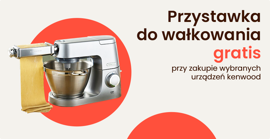 Po dodaniu do koszyka jednego z wymienionych robotów, a także użyciu kodu rabatowego, możesz zyskać również dodatkową przystawkę do robota, za która zapłacisz 1 zł. To wałkowarka do ciasta marki Kenwood, która pozwala na przygotowywanie domowych makaronów. Dzięki przystawce ciasto będzie gładkie i odpowiednio cienkie.