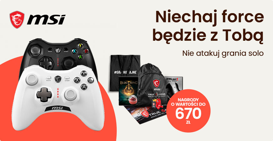 - Gamepady MSI Force – mowa tu o modelach: FORCE GC20 V2 i FORCE GC30 V2, które są dostępne w wersjach czarnych oraz białych. W przypadku tych sprzętów możesz zgarnąć nagrody o łącznej wartości 350 zł – jest to gra Elden Ring, Smok Brelok, torba Granko Fajne, a także kubek jajko Lucky of the Cup.