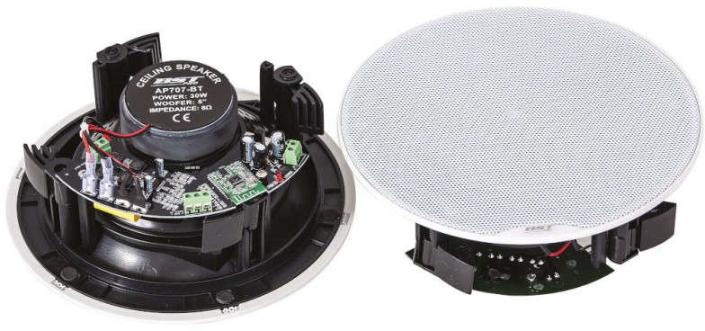 AP707-BT marki Bst to para aktywnych głośników sufitowych, instalacyjnych, składająca się z jednego aktywnego i jednego pasywnego głośnika. Dodatkowo ten zestaw zawiera wbudowany system Bluetooth z oddzielnym włącznikiem. Świetnym ułatwieniem jest wbudowane gniazdo Euroblock i możliwość podłączenia np. laptopa, z którego bezpośrednio można transmitować muzykę. Na bazie tych głośników można zbudować cały system nagłośnienia podłączając pod nie kolejne jednostki. Jest to idealne rozwiązanie do pubów, barów, klubów, restauracji ale również do zastosowań domowych i rozrywkowych.