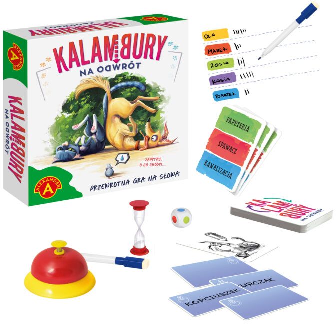 Ta gra niejednokrotnie zmusi cię, żebyś stanął na głowie niczym bohaterowie z okładki. Na szczęście nie będziecie musieli wykazać się niezwykłą sprawnością fizyczną. Jednak to nie oznacza, że będzie łatwo! Gracze w „Kalamburach na odwrót” staną przed nie lada wyzwaniem odgadnięcia właściwego hasła przedstawianego za pomocą słów, a nie jak dotąd – gestykulacji i mimiki. Aby zdobyć jak najwięcej punktów uczestnicy muszą rozszyfrować zagadkę i stworzyć pytanie, w którym zawarte będzie właściwe hasło. Urozmaiceniem zabawy są 2 rodzaje kart. Dzięki nim gracze mogą łatwo zaimplementować do zabawy własne propozycje kalambur.