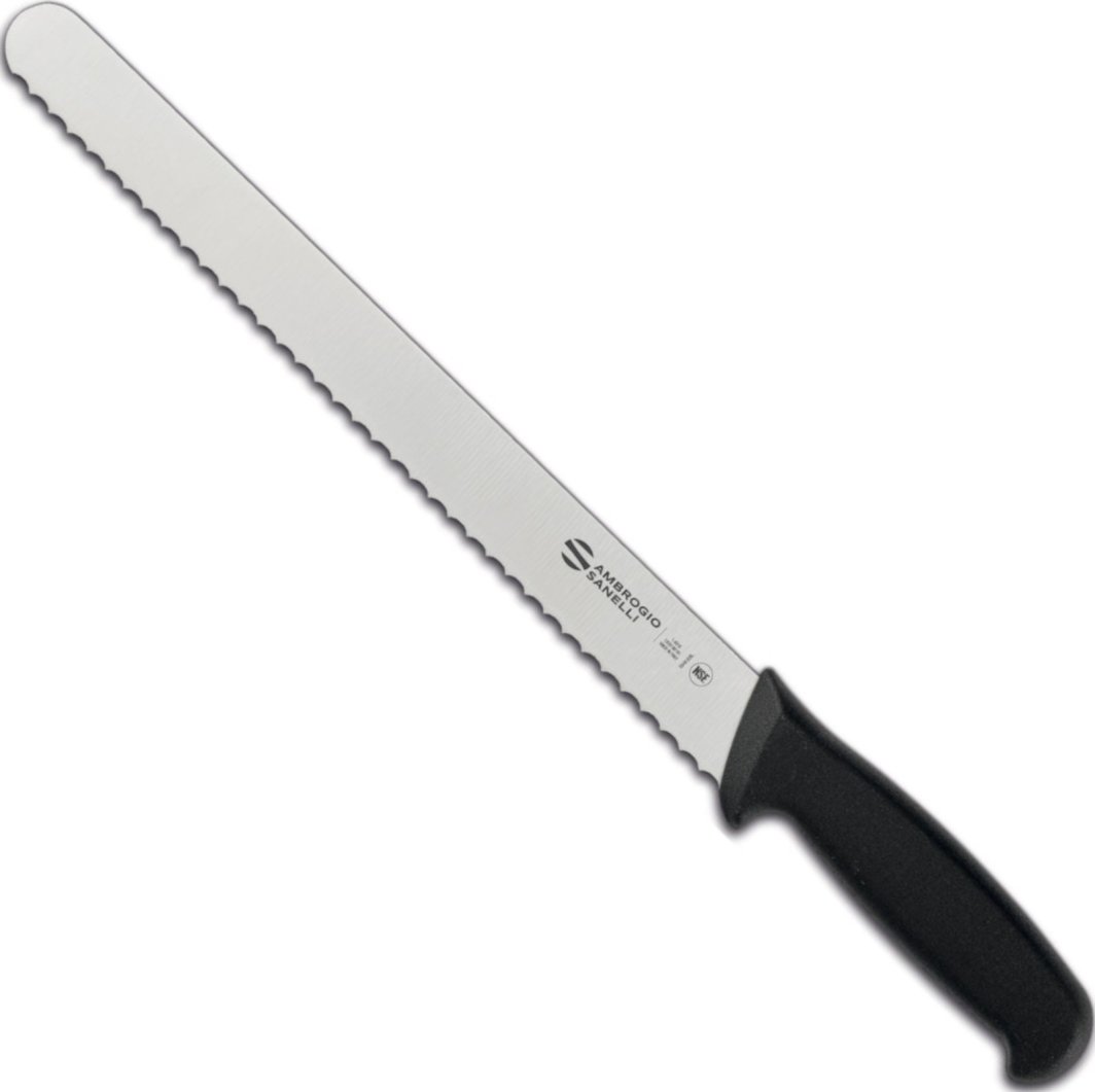 Nóż marki Ambrogio Sanelli z linii SUPRA to profesjonalne narzędzie przeznaczone dla szefów kuchni. Sprawdzi się szczególnie w cukierni czy piekarni. Posiada ostrze wykonane z wysokiej jakości stali nierdzewnej NITRO-B, w której dodatek cząsteczek azotu znacznie polepsza właściwości antykorozyjne oraz końcową twardość po ulepszaniu cieplnym. Ergonomiczny uchwyt wykonany został z trwałego tworzywa SEBS, które jest elastyczne i odporne na działanie czynników atmosferycznych, ozonu i UV. Nóż nadaje się do sterylizacji, jest wysoce odporny na uderzenia i korozję. Nie nadaje się do mycia w zmywarce.