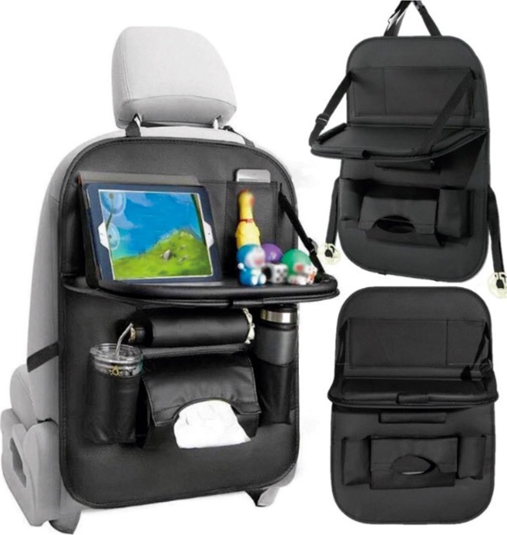 ORGANIZER NA FOTEL SAMOCHODOWY Organizer na tylne siedzenie ułatwi podróżowanie z rodziną. Dzięki intuicyjnemu mocowaniu, wielofunkcyjnym kieszeniom, schowkom oraz miejscu na tablet pozwoli na łatwy dostęp do przedmiotów potrzebnych podczas podróży. Dzięki niemu utrzymamy porządek oraz czystość przestrzeni pasażerskiej i tylnego oparcia siedzenia. ? Organizer posiada wygodną rozkładaną półkę , na której można postawić laptop, lub coś do jedzenia. ? Nakładka posiada kilka kieszeni różnej wielkości, które pozwolą pomieścić drobiazgi, słodycze i napoje. ? Montaż jest banalnie prosty i polega na przypięciu torby klamrą wokół zagłówka fotela. Łatwy montaż Pokrowiec wystarczy przełożyć przez przedni fotel i zamontować go za pomocą taśm, dzięki temu torba będzie stabilna. Organizer wykonany jest z tworzywa wodoodpornego oraz jest łatwy w czyszczeniu. Regulowane klamry, aluminiowy hak oraz mocne paski zapewniają dużą stabilność. JEST UNIWERSALNY, PASUJĄCY DO WSZYSTKICH TYPóW AUT.