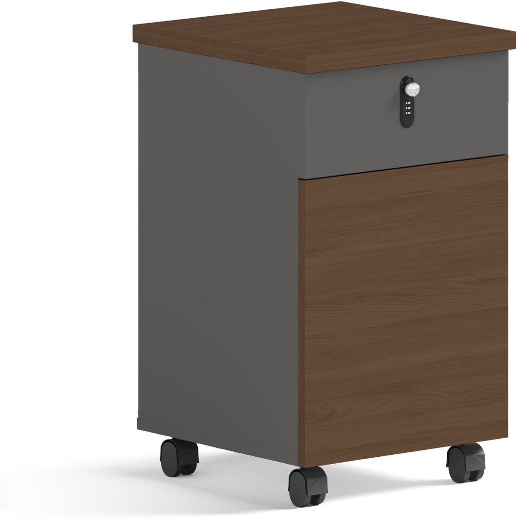 Kontener biurowy Angel Loft Work Dark to nowoczesny mebel, który łączy funkcjonalność, bezpieczeństwo oraz estetykę. Jego kompaktowa forma sprawia, że doskonale sprawdzi się zarówno pod biurkiem, jak i jako samodzielny element wyposażenia biura. Ciemny korpus w połączeniu z drewnianym frontem tworzy elegancki kontrast, idealnie wpisujący się w styl loftowy.