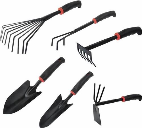 Zestaw aż 6 niezwykle przydatnych narzędzi ogrodniczych. To prawdziwy niezbędnik każdego szanującego się działkowca i ogrodnika :) W komplecie znajdują się dwie łopatki ogrodowe, grabki i pazurki ogrodnicze, motyczka z pazurkami oraz miotło-grabki. Narzędzia są kompaktowe i zajmują niewiele miejsca, przy czym są niezwykle funkcjonalne i sprawdzą się równie dobrze jak pełnowymiarowe odpowiedniki. Wygodne, ergonomiczne uchwyty z miękkiego tworzywa sztucznego zapewniają duży komfort użytkowania.