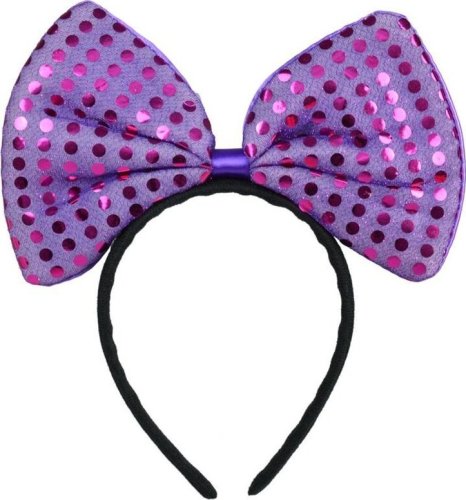 Fioletowa kokarda na opasce. Zdobiona jest połyskującymi kropeczkami. Idealne dopełnienie stroju na imprezę urodzinową, wieczór panieński lub zabawę karnawałową. Opaska wygodna w użytkowaniu, rozmiar uniwersalny. Rozmiar kokardy: 20 cm.
