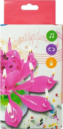 Nietuzinkowa świeczka urodzinowa w kształcie zamkniętego pąku kwiatowego w kolorze niebieskim. Po zapaleniu głównej, środkowej świeczki kwiat otwiera się, kręci oraz gra melodię "Happy Birthday". Na każdym płatku znajdują się małe świeczki, które odpalają się samodzielnie od świeczki głównej dając wyjątkowy efekt wizualny. Świeczka o wysokości 11,5 cm. Szerokość po rozłożeniu płatków około 17 cm. Produkt posiada atest PZH.