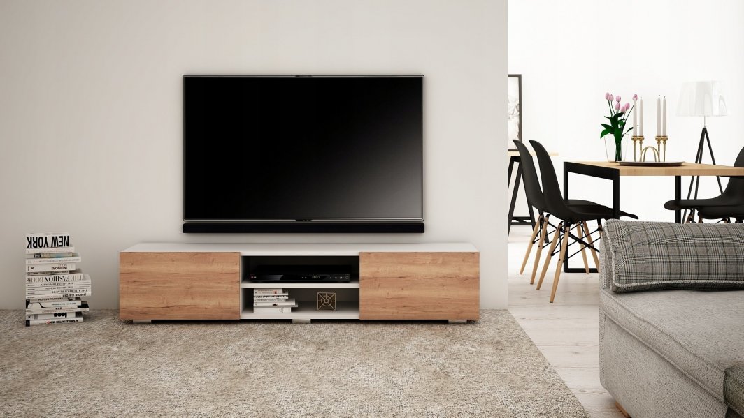 Stojąca szafka RTV została wykonana z materiałów wysokiej jakości. Korpus oraz fronty z płyty wiórowej laminowanej o grubości 18 mm zapewniają trwałość i odporność na uszkodzenia. Tylna płyta z HDF dodatkowo wzmacnia konstrukcję mebla.