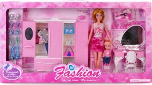 W zestawie: lalka 29 cm., laleczka 8 cm., toaletka z lustrem i krzesełkiem, szafa, 4 torebki, 5 par butów, 3 ubranka, akcesoria fryzjerskie. Wymiary opakowania: 65 x 34 x 9 cm. Wiek 3+.