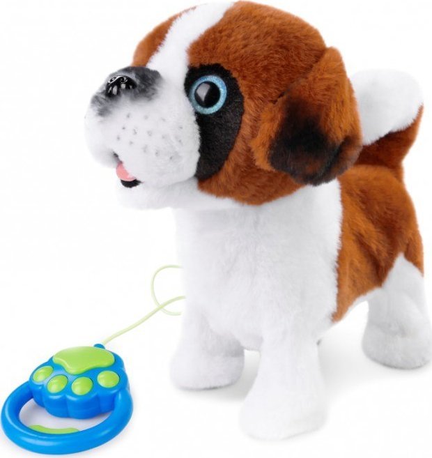 Główną atrakcją zabawki jest dołączona smycz z wbudowanym kontrolerem, która pozwala dziecku prowadzić pieska na spacer. Po aktywacji odpowiedniego przycisku czworonóg zaczyna dziarsko kroczyć do przodu, merdając przy tym radośnie ogonkiem. Takie rozwiązanie zachęca najmłodszych do aktywności ruchowej i wspólnej zabawy w domu lub na płaskim podłożu. Mechanizm ruchu jest płynny i dostosowany do tempa małych dzieci, co sprawia, że wspólne spacery są czystą przyjemnością.