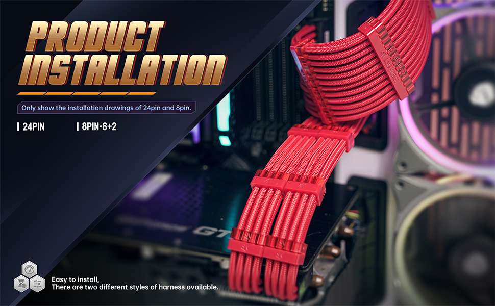 Przedłużacze wykonane są z wysokiej jakości materiałów, które zapewniają stabilną prace i długą żywotność. Przewody wykonane są z miedźi cynowanej UL1015 18AWG , która jest bardzo wytrzymała i odporna na wysoką temperaturę. Przewody są kompatybilne ze wszystkimi zasilaczami, takimi jak serie RM, RMX RM550x, RM650x, RM750x, RM850x, RM1000x, HX1000, Corsair CX, itp.