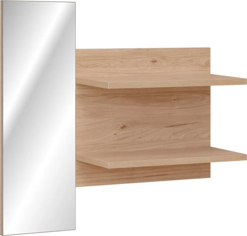 Prostokątne lustro wiszące PEDRO z półkami do przedpokoju Wiszące lustro PEDRO tworzy z półkami panel ścienny, który będzie doskonałym elementem uzupełniającym do Twojego przedpokoju. Dzięki niemu szybko i sprawnie dopracujesz swój nienaganny wygląd przed wyjściem. Lustro powiększy także optycznie pomieszczenie, co jest świetnym rozwiązaniem do niedużych przedpokojów. Wykonanie półek z laminowanej płyty sprawia, że cała konstrukcja jest solidna i trwała, dzięki czemu możesz bezpiecznie postawić na nich potrzebne drobiazgi lub ustawić ulubione dekoracje. Kolor płyty hickory jackson imituje wybarwienie naturalnego drewna, które wprowadzi do Twojego wnętrza ciepły i przytulny klimat. Lustro PEDRO dzięki swojej nowoczesnej, a zarazem prostej formie odnajdzie się w każdym wnętrzu, dopełni Twój hol i sprawi, że szykowanie się do wyjścia stanie się łatwiejsze i bardziej komfortowe. Cechy produktu: prostokątne lustro wiszące do przedpokoju, panel z półkami z płyty laminowanej, kolor hickory jackson, do samodzielnego montażu, w swojej ofercie posiadamy szeroki wybór mebli pozwalających na kompleksowe wyposażenie mieszkania.