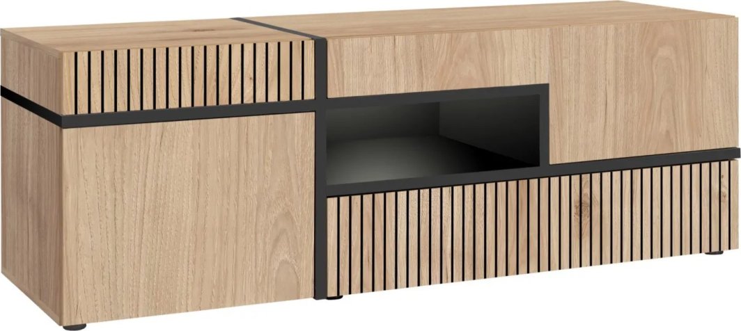 Nowoczesna szafka RTV CROSS LED z szufladą Szafka RTV CROSS LED to innowacyjne i eleganckie rozwiązanie do Twojego salonu, łączące w sobie nowoczesny design z wyjątkową funkcjonalnością. Szafka zaprojektowana z myślą o estetyce i praktyczności wykonana jest z solidnej i trwałej płyty laminowanej w kolorze hickory jackson przypominającym drewno. Fronty wzbogacone zostały o czarne paski imitujące modne ryflowania. Użyta do produkcji mebla płyta laminowana charakteryzuje się dużą wytrzymałością i odpornością na uszkodzenia. Maksymalne obciążenie górnego blatu wynosi 40 kg, co pozwala bezpiecznie ustawić na niej nawet większych rozmiarów telewizor. Wbudowane w otwartą przestrzeń oświetlenie LED wprowadza unikalny klimat do wnętrza, podkreślając wyeksponowane przedmioty i tworząc przytulną atmosferę. Szafka RTV została wyposażona w szufladę i drzwiczki, które zapewniają mnóstwo miejsca do przechowywania. Dzięki temu, Twoje salon zawsze pozostaje uporządkowany, a niezbędne przedmioty są łatwo dostępne. Dzięki użyciu nowoczesnego systemu otwierania push-click szafka nie tylko świetnie wygląda, ale także oferuje niezwykle wygodny dostęp do przechowywanych rzeczy. Brak uchwytów nadaje meblowi także nowoczesnego wyglądu i zapewnia czystą, minimalistyczną estetykę. Dodatkowym praktycznym elementem szafki jest umiejscowiony na tylnej ściance przepust kablowy, który umożliwia łatwe i estetyczne podłączenie sprzętu RTV. Dzięki temu eliminujesz problem plątaniny kabli i zachowasz schludny wygląd w swoim salonie. Prosta forma i minimalistyczne detale sprawiają, że szafka doskonale komponuje się z różnymi stylami wnętrzarskimi. Szafka RTV CROSS LED to nie tylko praktyczny mebel, ale również elegancki element dekoracyjny, który wprowadzi do Twojego salonu nowoczesność, komfort i styl. To doskonałe połączenie estetyki i funkcjonalności, które spełni oczekiwania nawet najbardziej wymagających użytkowników. Cechy produktu podświetlana szafka RTV do salonu, szafka z szufladą i drzwiczkami, szafka wykonana z płyty laminowanej, kolor hickory jackson/czarny, fronty zdobione czarnymi paskami imitującymi ryflowania frontów, oświetlenie LED w zestawie, system otwierania push-click, przepust kablowy ułatwiający podłączenie sprzętu RTV, max. obciążenie górnego blatu 40 kg, nowoczesny design, do samodzielnego montażu w swojej ofercie posiadamy szeroki wybór mebli pozwalających na kompleksowe wyposażenie mieszkania.
