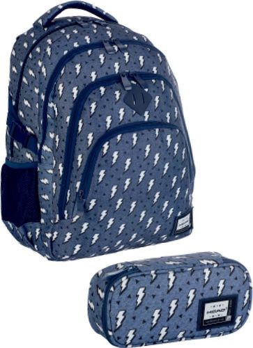 Czterokomorowy jeansowy plecak w komiksowe błyskawice.