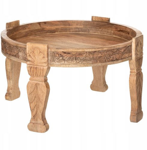 Rzeźbione detale na nogach i rancie stolika nadają mu niepowtarzalnego stylu. Te subtelne akcenty sprawiają, że każdy egzemplarz jest wyjątkowy, a Twój dom zyska na elegancji i oryginalności.