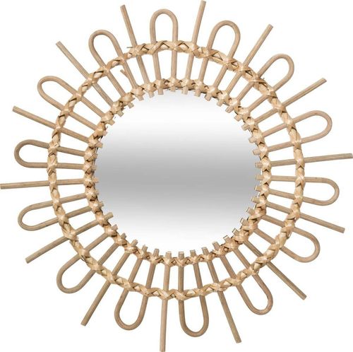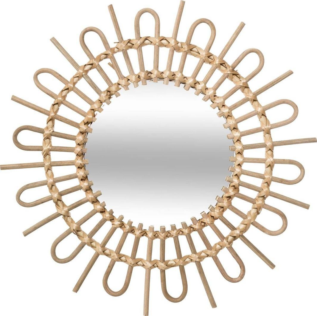 Okrągłe lustro ścienne z wiklinową, plecioną ramą w kształcie Słońca. Praktyczny dodatek do salonu, sypialni lub przedpokoju, który jednocześnie stanowił będzie oryginalną dekorację. Wykonanie z wysokiej jakości surowca oraz ciekawy design czynią z tego modelu idealne uzupełnienie zwłaszcza do wnętrz urządzonych w stylu boho lub skandynawskim. Średnica tafli lustra: 23 cm