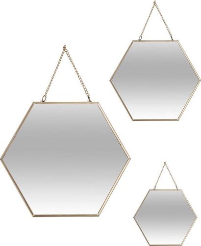 Lustro to uniwersalny dodatek, który oprócz walorów praktycznych będzie stanowił efektowną ozdobę ścienną. Wybierając ten zestaw luster możemy w dowolny sposób modyfikować ich położenie względem siebie tworząc niezwykłe kompozycje. Lustra osadzone są w metalowych, złotych ramach co podnosi efekt wizualny. Wymiary poszczególnych luster: - duże: 29x0,3 cm, wys. 29 cm - średnie: 24x0,3 cm, wys. 24 cm - małe: 20x0,3 cm, wys. 20 cm