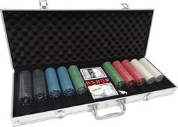 W skład zestawu wchodzą dwie talie kart, komplet kości oraz 500 żetonów do gry i żeton krupiera. Wszystko to zapakowane w elegancką, aluminiową walizkę wyłożoną pianką, z zamkami na kluczyk (kluczyki w zestawie).