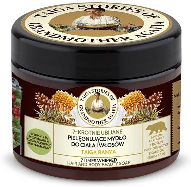 Mydło do ciała i włosów oparte na recepturze i wyciągach z syberyjskich ziół. Łagodnie myje i oczyszcza włosy i skórę głowy. Nawilża i odżywia. Nadaje włosom blask, a skórze miękkość. Odbudowuje włosy i dogłębnie odżywia naskórek. Eurobio Lab to wschodnioeuropejski producent kosmetyków opartych na składnikach. Receptury Babuszki Agafii Taiga Stories to linia kosmetyków oparta na staranie wyselekcjonowanych ziołach pochodzących z Tajgi. 7-krotnie ubijane pielęgnujące mydło do ciała i włosów z mlekiem cedrowym. Miód odżywia włosy i sprawia, że stają się bardziej gładkie i miękkie. Olejek sosnowy odżywia i odmładza skórę, dodając jej blasku. Składnik myjący na bazie mydlnicy lekarskiej wspomaga zachowanie świeżości włosów i ciała na dłużej.