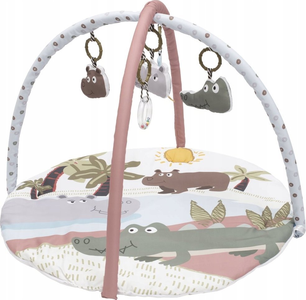 W zestawie znajduje się pałąk z pluszowymi zabawkami oraz grzechotkami, które można łatwo odczepić i używać poza matą. To zwiększa funkcjonalność produktu i zapewnia dodatkowe możliwości zabawy, co z pewnością przyciągnie uwagę najmłodszych.