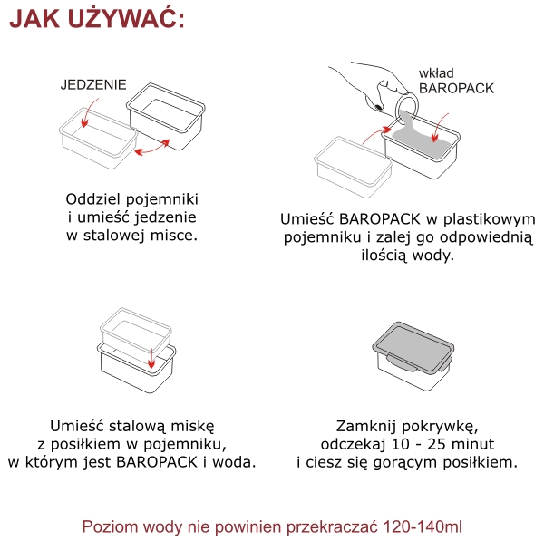 Pojemnik Barocook służy do gotowania bez ognia - prosto i wygodnie przy wszelkiego typu zajęciach na świeżym powietrzu. Podgrzewaj wszelkie produkty spożywcze/pokarmy przy pomocy filiżanki wody. Do podgrzewania służy specjalny wkład Baropack, który po polaniu wodą nagrzewa pojemnik z jedzeniem/napojem. Podgrzewa jedzenie aż do temperatury 98°C.
