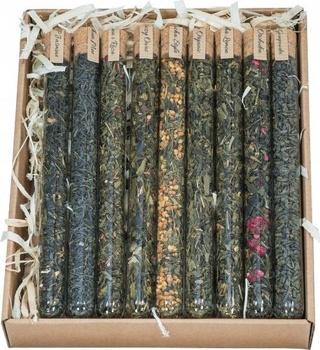 Wyjątkowy zestaw 9 smaków herbaty. Herbaty zapakowane są w szklane próbówki, a wszystko to umieszczone jest w ozdobnym pudełku prezentowym wypełnionym siankiem z dedykacją i życzeniami.