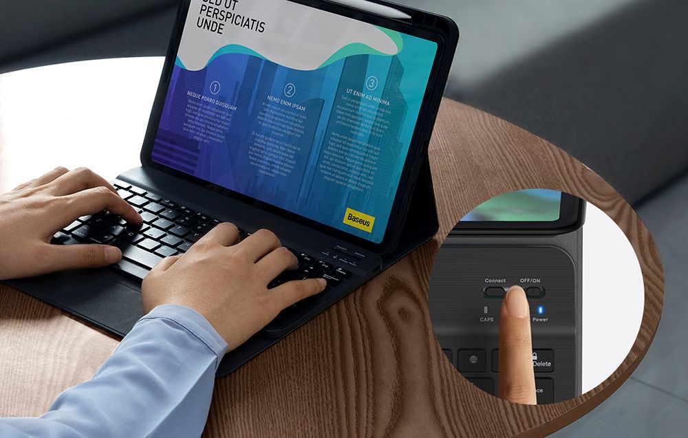 Stwórz wygodny zestaw do pracy przy pomocy tabletu i etui z klawiaturą marki Baseus. Produkt szybko i sprawnie łączy się z Twoim urządzeniem, nie powodując zakłóceń. Etui oferuje wysokiej jakości klawisze multifunkcyjne, które usprawnią pracę. Materiał, z jakiego powstał case, jest lekki i przyjazny dla skóry. Dodatkowo zapewnia wyjątkową wygodę i stabilność, dzięki wbudowanej podpórce.