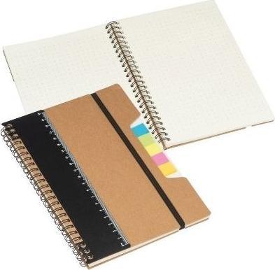 Notes A5 w kartonowej okładce z plastikową linijką, 120 pustymi stronami, karteczkami samoprzylepnymi i zamknięciem na gumkę.