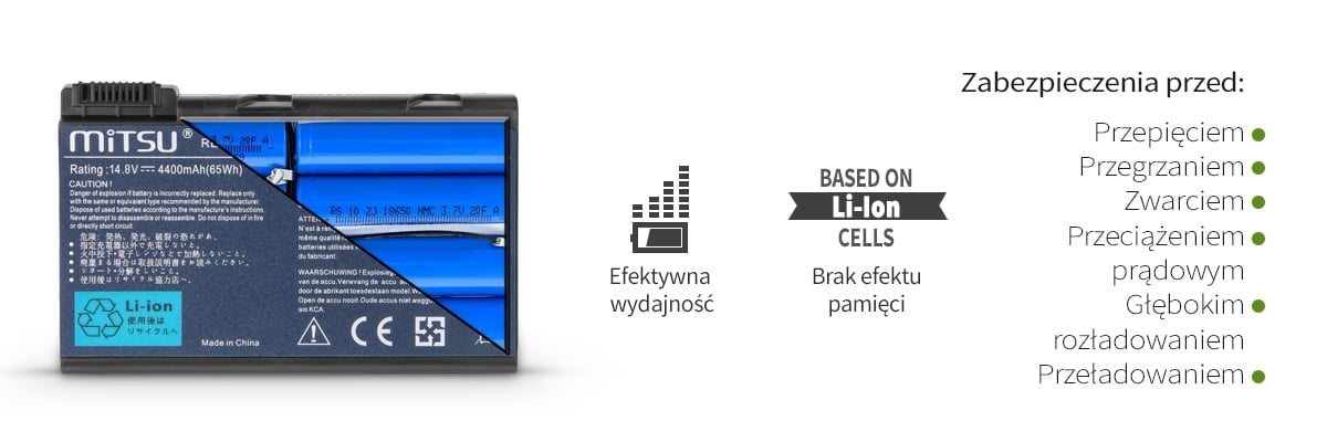 Akumulatory MITSU to sprawdzone i docenione już przez dziesiątki tysięcy klientów dedykowane baterie do notebooków i laptopów oraz ultrabooków i netbooków, znane przede wszystkim na rynku polskim i czeskim. Każda bateria sygnowana logiem MITSU to wyjątkowa dbałość o bezpieczeństwo. Fabrycznie nowe zabezpieczenia przed przepięciem, przegrzaniem, zwarciem, przeciążeniem prądowym, głębokim rozładowaniem i przeładowaniem to dla Ciebie spokój ducha, a dla MITSU – obowiązek i obietnica nienaruszalnych standardów jakości.