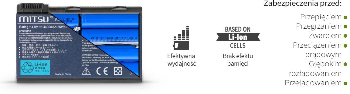 Akumulatory MITSU to sprawdzone i docenione już przez dziesiątki tysięcy klientów dedykowane baterie do notebooków i laptopów oraz ultrabooków i netbooków, znane przede wszystkim na rynku polskim i czeskim. Każda bateria sygnowana logiem MITSU to wyjątkowa dbałość o bezpieczeństwo. Fabrycznie nowe zabezpieczenia przed przepięciem, przegrzaniem, zwarciem, przeciążeniem prądowym, głębokim rozładowaniem i przeładowaniem to dla Ciebie spokój ducha, a dla MITSU – obowiązek i obietnica nienaruszalnych standardów jakości.