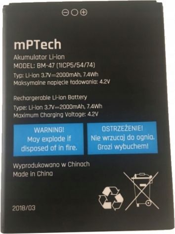 Bateria do myPhone myPhone POCKET 18x9 BM-47 Oryginał Pojemność:2000 mAh Teraz twój telefon może działać jeszcze dłużej! Wymień swoją starą baterie, lub posiadaj zapasową, aby nie zostać bez kontaktu ze swiatem w najbardziej potrzebnym momencie.