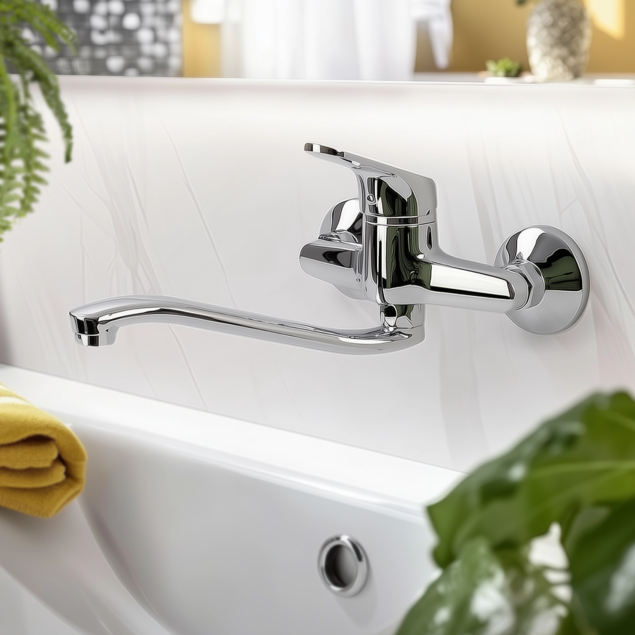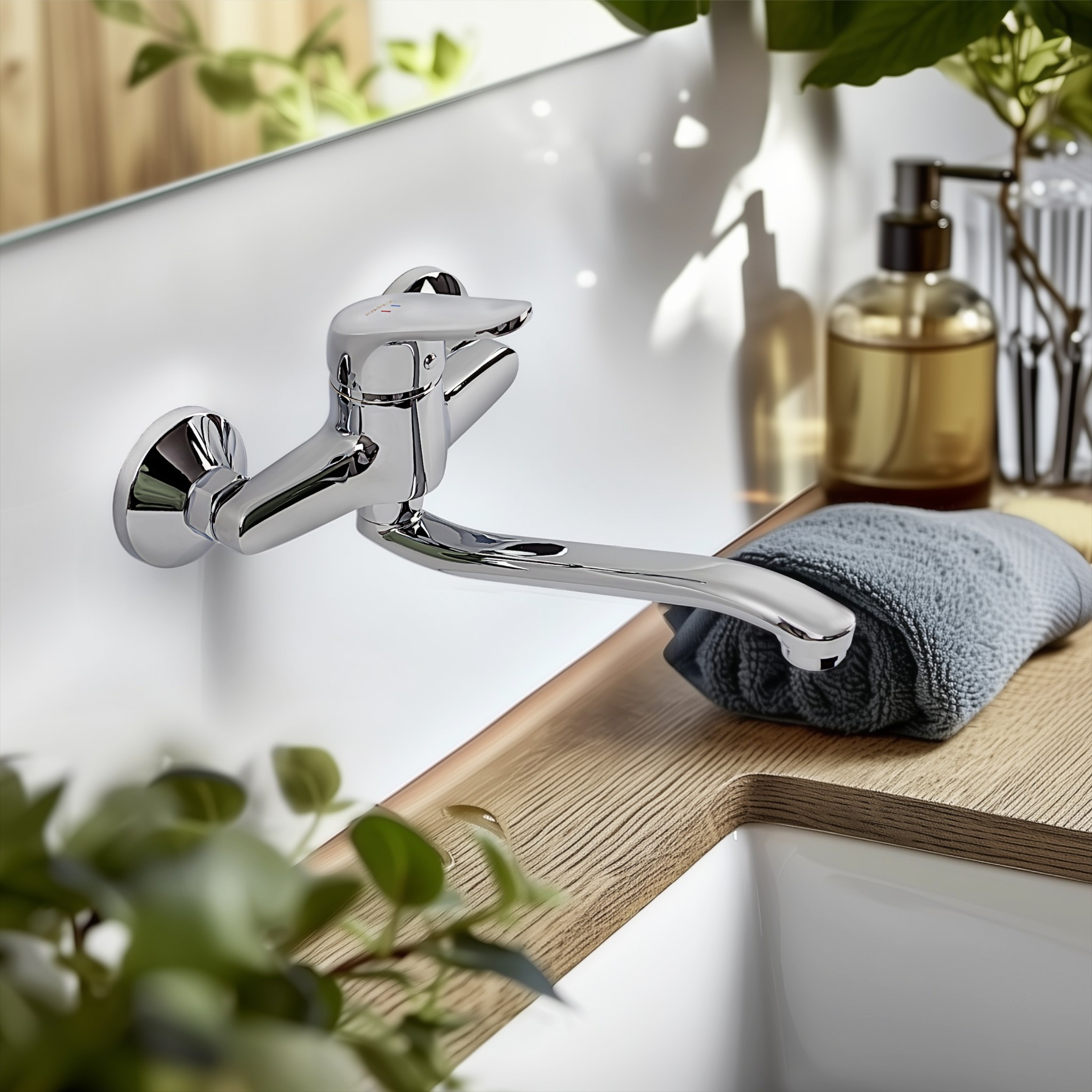 Bateria umywalkowa ścienna ABWE7311O1-U Nowoczesna bateria umywalkowa ścienna z obrotową wylewką to funkcjonalne rozwiązanie do każdej łazienki. Wykonana z trwałych materiałów i pokryta elegancką warstwą chromu, zapewnia nie tylko estetyczny wygląd, ale i wygodę codziennego użytkowania. Jednouchwytowa konstrukcja umożliwia precyzyjne ustawienie temperatury i siły strumienia wody. Idealna do montażu nad zlewem, w aranżacjach klasycznych i nowoczesnych.