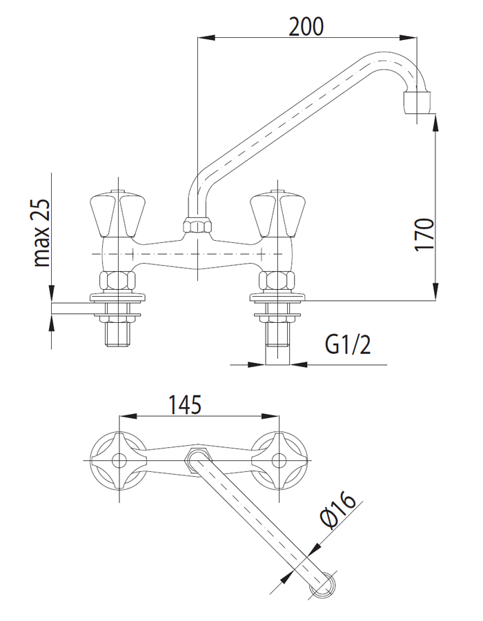 Bateria posiada obrotową, dwuotworową wylewkę, głowice suwakowe, uchwyty chromowane i napowietrzacz. Przepływ wody wynosi 15 l/min, a ciśnienie robocze 3 Atm. Temperatura wody może wynieść maksymalnie ≤90 [°C]. Rozstaw przyłączy to 145±20 mm, a długość wylewki 200 mm.