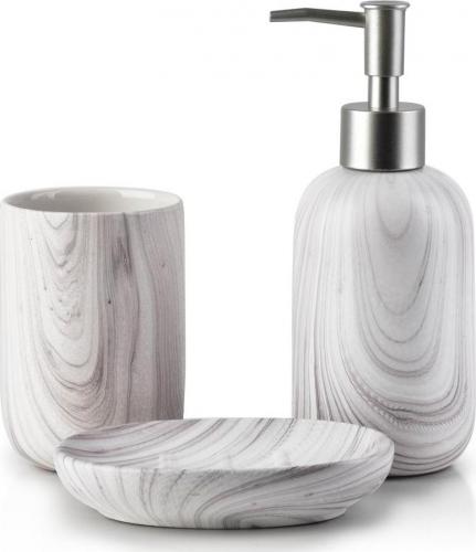 Komplet akcesoriów łazienkowych marki BATHLAB by MONDEX wykonany z ceramiki. Trzyczęściowy zestaw składający się z dozownika na mydło w płynie lub balsam, mydelniczki oraz kubka na przybory. dozownik 7x7xh19cm 350ml kubek 7x7xh10,5cm podstawka:12x8xh2,5cm