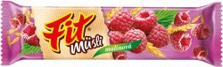 Batoniki Fit są wyrabiane wyłącznie z naturalnych składników.Jedną z najważniejszych części tych batoników są owoce.Dzięki swojemu składowi, batony są cennym źródłem błonnika, witamin i minerałów.Batonik jest dobrym uzupełnieniem dziennego zapotrzebowania kalorii.Wyprodukowano w CzechachSkładniki: syrop skrobiowy, płatki OWSIANE i PSZENNE 22%, rodzynki (rodzynki, olej roślinny słonecznikowy), kukurydza ekstrudowana, suszone jabłka, tłuszcz roślinny (palmowy), SOJA rozdrobniona, granulat malinowy 2,5% (syrop glukozowy, cukier, maliny 20%, substancja zagęszczająca: alginian sodu), emulgator: lecytyna SOJOWA, aromat. Informacja alergiczna: produkt zawiera gluten i soję oraz może zawierać orzechy, orzeszki ziemne, mleko i dwutlenek siarki.Przechowywać w suchym i chłodnym miejscu.Wartość odżywcza: w 100 g produktu: wartość energetyczna: 1560 kJ/372 kcal tłuszcz: 7,6 g - w tym nasycone kwasy tłuszczowe: 3,1 g węglowodany: 66,0 g - w tym cukry: 27,2 g błonnik: 6,7 g białko: 5,9 g sól: 0,046 g