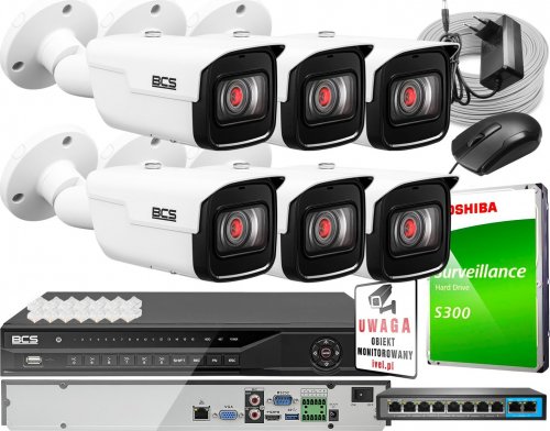 BCS ZM13050 Zestaw monitoringu dla ochrony parkingu hali magazynu z 6x Kamera 4MP BCS-TIP5401IR-V-V + Akcesoria