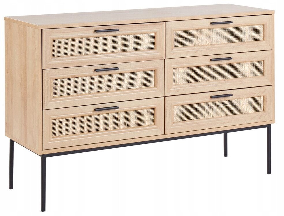 Komoda PASCO z sześcioma szufladami to elegancki i praktyczny mebel, który doskonale wpasuje się w różnorodne przestrzenie, takie jak salon, sypialnia czy przedpokój. Wykonana z materiałów najwyższej jakości, oferuje nie tylko estetyczny wygląd, ale także trwałość. Jej rattanowe fronty nadają nowoczesny charakter, a delikatne, metalowe uchwyty w kolorze srebrnym podkreślają jej styl.