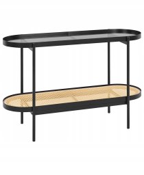 Pod blatem znajduje się praktyczna półka z technorattanu, ozdobiona plecionką wiedeńską, co nadaje meblowi przytulnego charakteru. To doskonałe miejsce na przechowywanie lub eksponowanie dekoracji, które wzbogacą Twoje wnętrze.