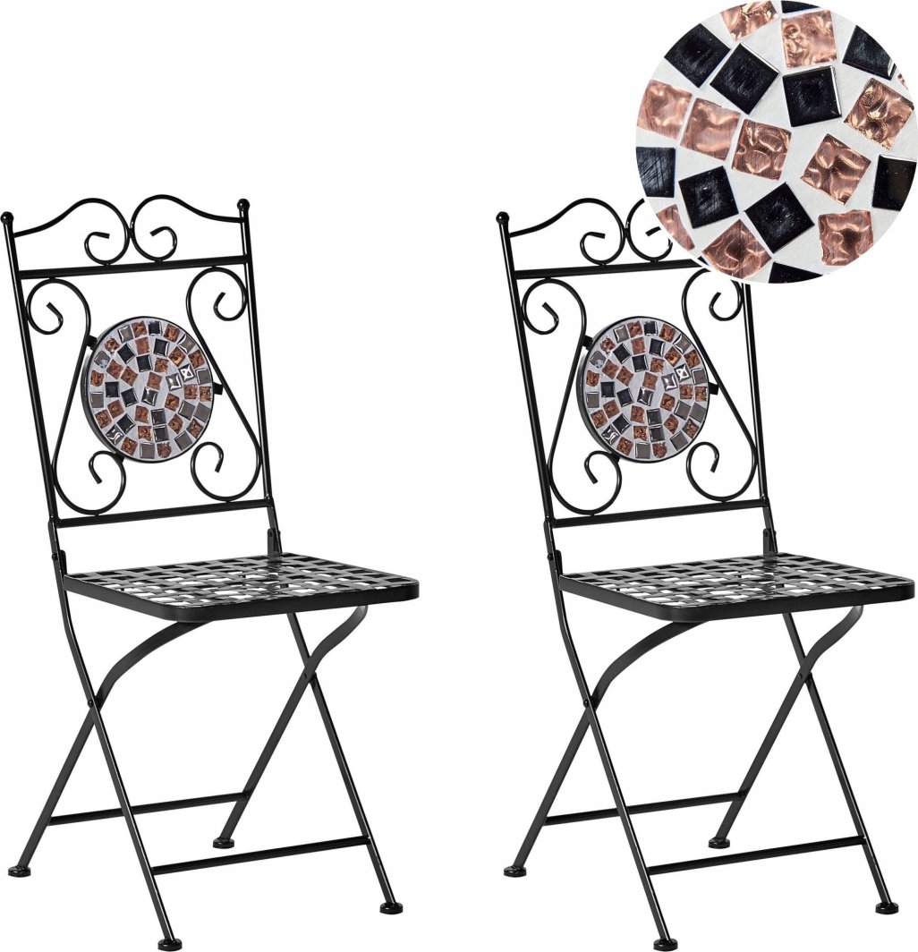 Te krzesła przyciągają uwagę dzięki misternemu wzorowi mozaiki na oparciu, złożonemu z drobnych czarno-złotych kafelków, co nadaje im wyjątkowy retro charakter. Styl vintage sprawia, że doskonale wpasowują się w każdą przestrzeń patio lub ogrodu, dodając im niepowtarzalnego uroku i elegancji.
