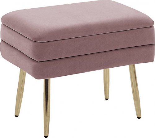 Twój salon czy sypialnia staną się pełniejsze dzięki tej ławce z pojemnikiem. Jej różowa tapicerka wykonana z wytrzymałego weluru, podkreślona jest za pomocą złotych nóżek, co czyni mebel eleganckim i przyciągającym uwagę. Pojemny schowek ukryty jest za wiekiem, znajdującym się na siedzisku ławki, dzięki czemu rzeczy schowane w nim zawsze będą pod ręką. Rozmiary ławki umożliwiają też na postawienie jej w mniejszych pomieszczeniach, takich jak korytarz czy garderoba.