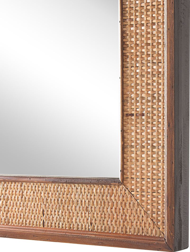 Lustro ścienne w ręcznie wykonanej ramie w stylu boho. Jeśli szukasz prostego sposobu na wykończenie pomieszczenia to lustro będzie idealnym rozwiązaniem. Praktyczne, a jednocześnie dekoracyjne, oprawione w ręcznie wykonaną ramę o wykończeniu, z łatwością wpasuje się w aranżacje w stylu boho. Ozdobna bambusowa plecionka dodaje mu swoistego uroku, a ciemne krawędzie optycznie je powiększają.